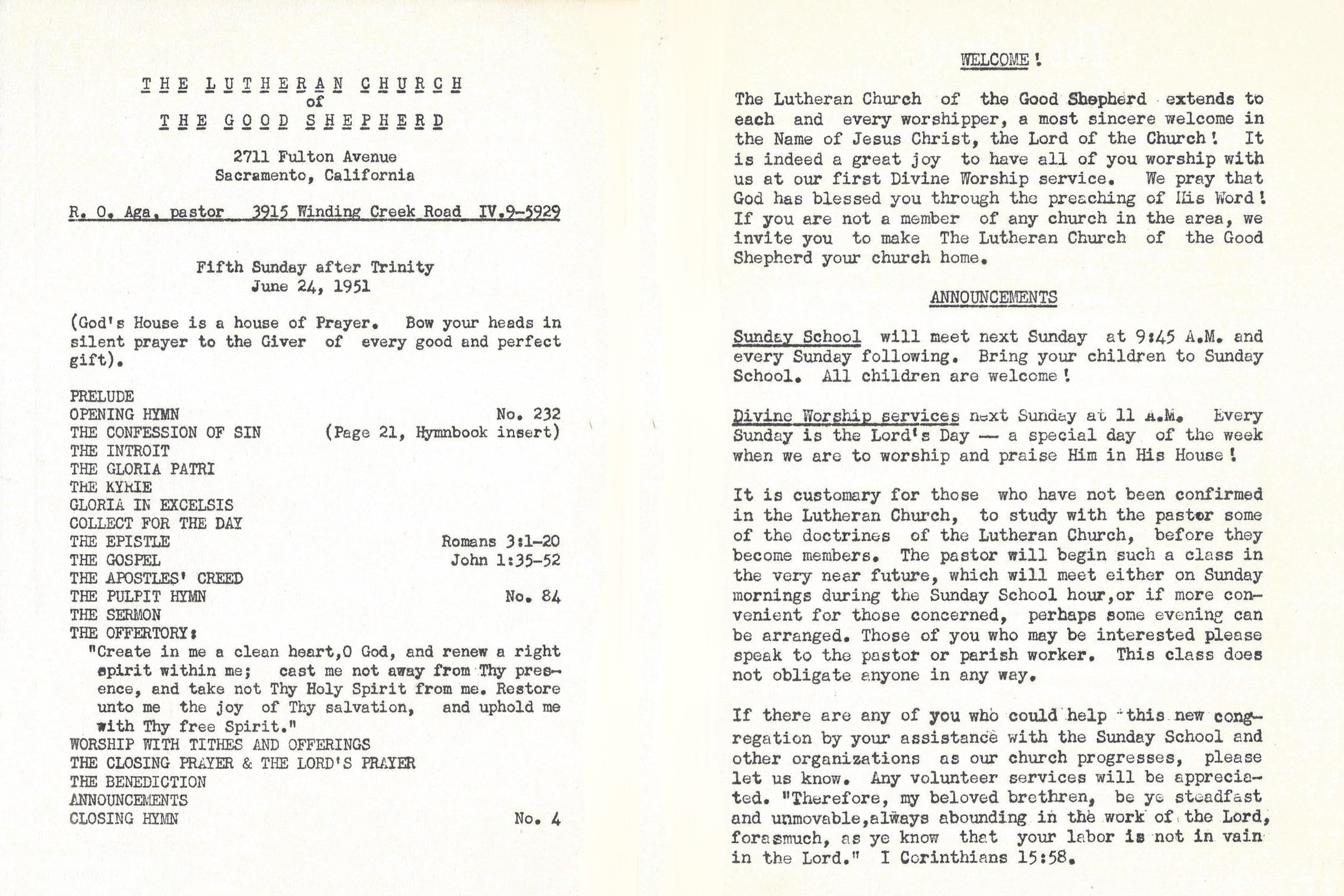 Pastor R. O. Aga and his family arrived in Sacramento from Pasadena on April 1, 1951 to begin ministry at the new mission church venture. The North Area was a different world; starting a new Church in a sparsely populated community was a tremendous challenge. By the end of 1951, however, Parish Worker Doris Johnson had made 2000 contacts although only two dozen Lutheran Families were living in the immediate area. Of these families, most already held membership in downtown Lutheran churches. On May 31, 1951, the first meeting of interested families at the parsonage, 3915 Winding Creek Road. By diligent work and God’s blessing, Pastor Aga held the first services on June 24, 1951, at 2711 Fulton Avenue in the Town and Country Recreation Center where they met for four months.