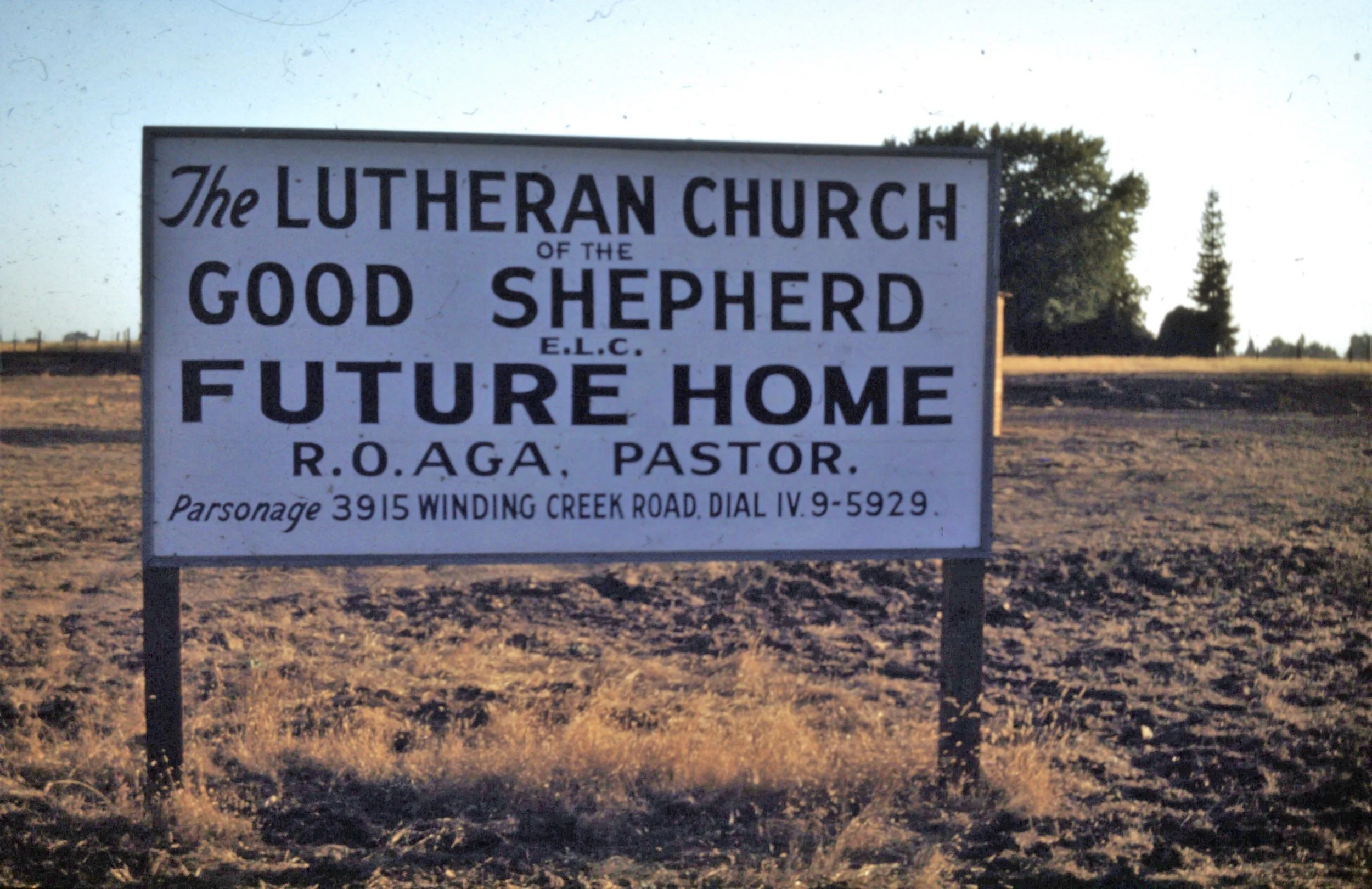 In February 1951, District President Gaylerd Falde and Dr. Phillip S. Dybvig, Director of Home Missions of the Evangelical Church, and Pastor Aga visited the site. The property at Arden Way and Morse was purchased from Anna and Otto Moller, who became charter members. A suitable parsonage at 3915 Winding Creek Road was secured at that time.